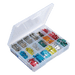 This transparent plastic case with 18 sections contains 360 popular glass, mini blade and standard ATS blade fuses. A base label identifies the fuse with a graphic image, part number and description to make re-ordering easy
